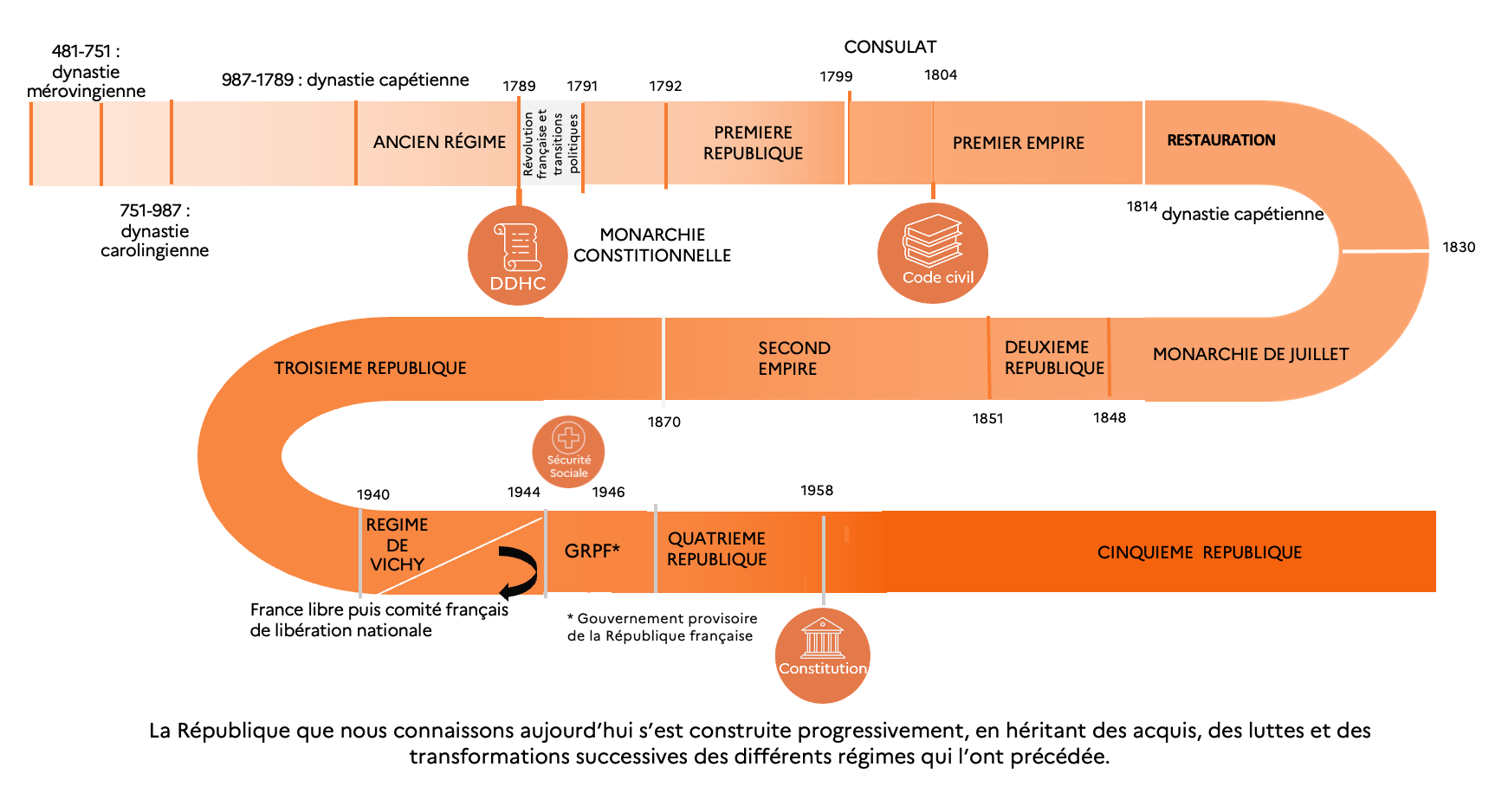La République telle que nous la connaissons aujourd’hui s’est construite progressivement. Elle a hérité des acquis, des luttes et des transformations des différents régimes qui l’ont précédée.