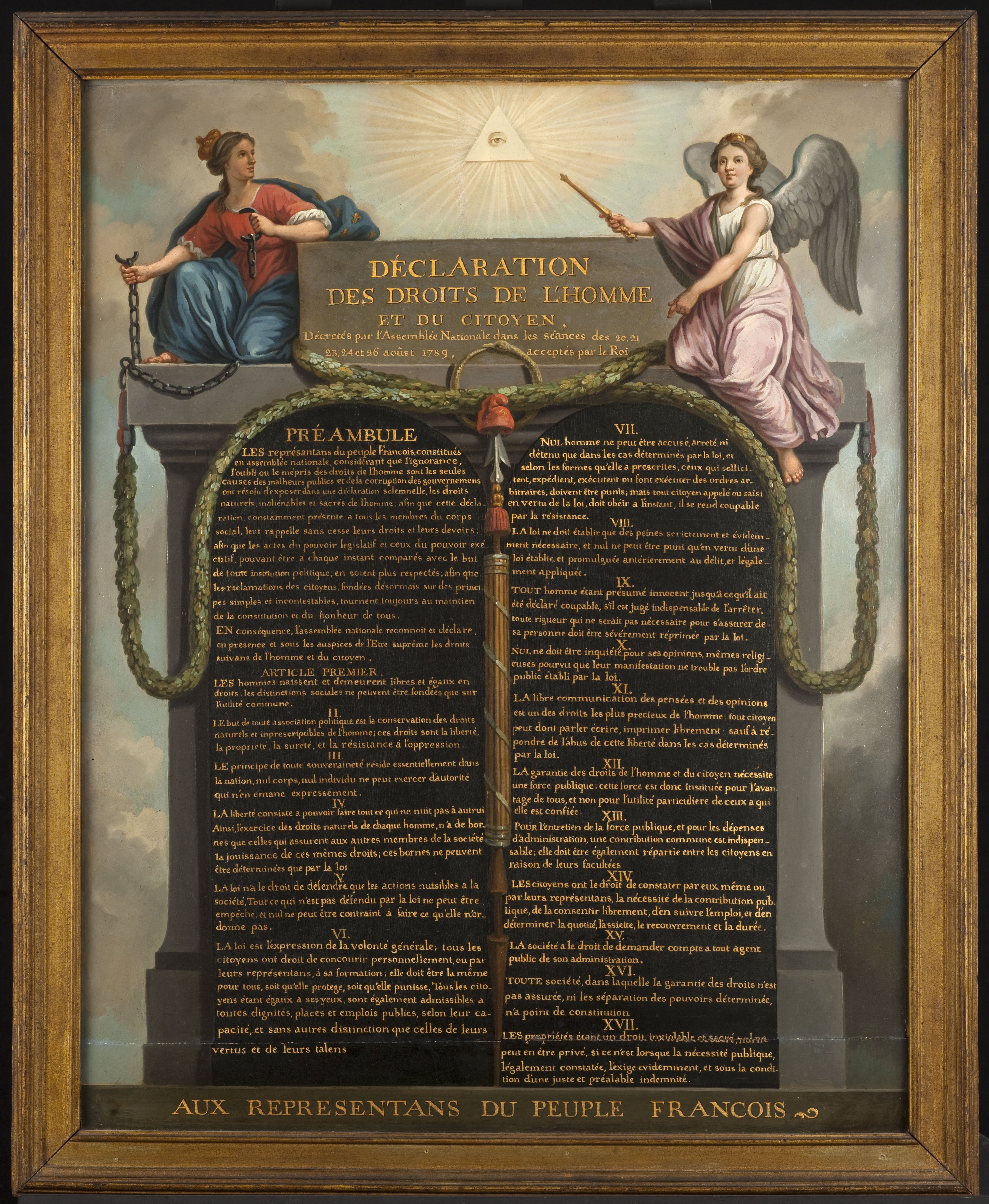 En conséquence, l’Assemblée nationale reconnaît et déclare, en présence et sous les auspices de l’Être Suprême, les droits suivants de l’homme et du citoyen.