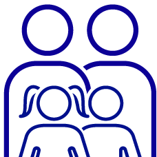 (Illustration : dessin violet représentant un adulte et deux enfants bras levés)